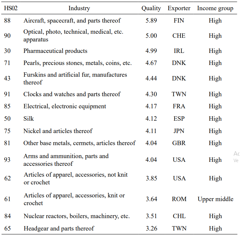 Most high-end selected industries presented in Table 3 originate from high-income countries, with the exception of ‘Articles of apparel, accessories, knit or crochet’ imported from Romania, confirming the analysis from Table 2. Among the fifteen highest-quality industries, ‘Articles of apparel, accessories, not knit or crochet,’ ‘Articles of apparel, accessories, knit or crochet,’ ‘Nuclear reactors, boilers, machinery, etc.,’ and ‘Headgear and parts thereof’ were those with the lowest average quality levels, originated in the United States, Romania, Chile, and Taiwan, respectively.