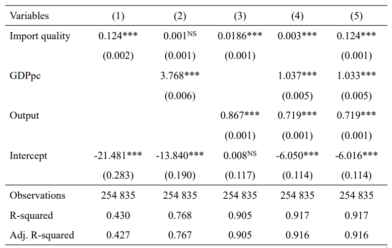 Table 4 shows differing estimations checks. Though we included exporting country and product effects in all regressions, in columns (1)-(5), we can observe that as we consider predetermined variables (GDP per capita and output), the estimated parameter of import quality reduces. This means that had we not added these covariates, we would probably have generated biased estimates of the impact of import quality on wages. When comparing estimates of import quality in columns (1) with (8), the direction of such a bias is evidenced. The negligence of relevant variables, as shown in column (1), produces an overestimated effect originating from high-quality imports and Brazilian wages.