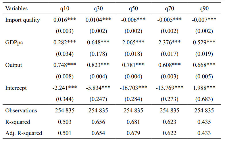 Similar to Table 4, the results shown in Table 5 suggest a relatively small effect of the quality of imports on the wage distribution quantiles. More specifically, the coefficients for the quality of imports reveal a positive correlation with the dependent variable for the first two wage quantiles, q10 and q30. This indicates that lower wage levels suffer an increase of 1.60% and 1.04% for the q10 and q30 quantiles, respectively, as the quality of imports rises.