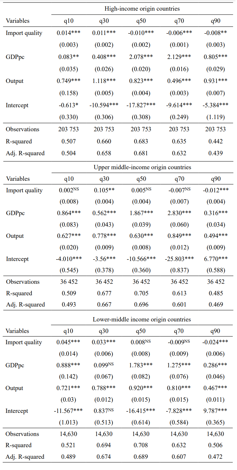Regarding the comparison among income groups, we expected that the estimates for high- and upper middle-income countries would yield higher coefficients for the variable quality vis-à-vis those observed for lower middle-income origin countries. This relationship relates to the income structure of the richest exporting country, which, in theory, is better endowed in terms of capital and skilled labor and, consequently, has the necessary means to manufacture higher-quality products (Brambilla & Porto, 2016).