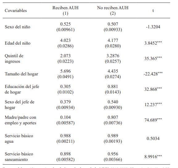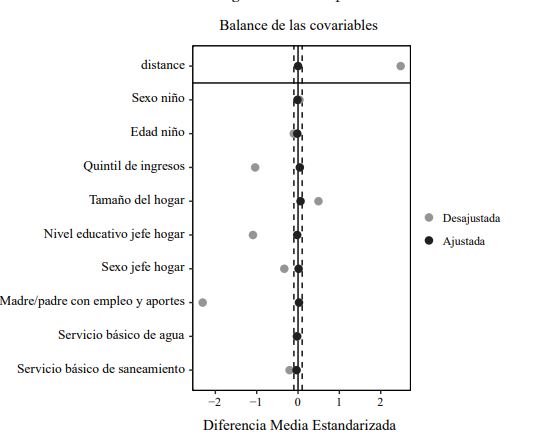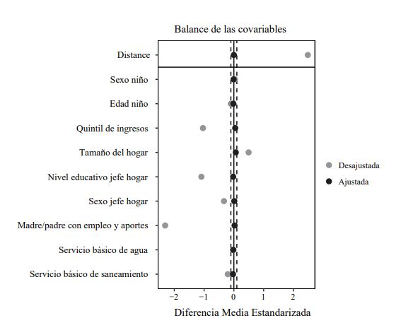 Por otro lado, la eficiencia del método de emparejamiento se basa en la incorporación al análisis de un conjunto de variables que no solo afectan la participación en el programa, sino que también constituyen determinantes de las variables resultado (Stuart, 2010). Por este motivo, y en base a la bibliografía revisada, se seleccionaron las siguientes variables: sexo y edad del niño, tamaño del hogar, quintil de ingresos al que pertenece el hogar, máximo nivel educativo y sexo del jefe de hogar, madre o padre con empleo y aporte a la seguridad social y acceso a servicios de agua y saneamiento básicos. La tabla A1 del apéndice describe cada una de ellas.