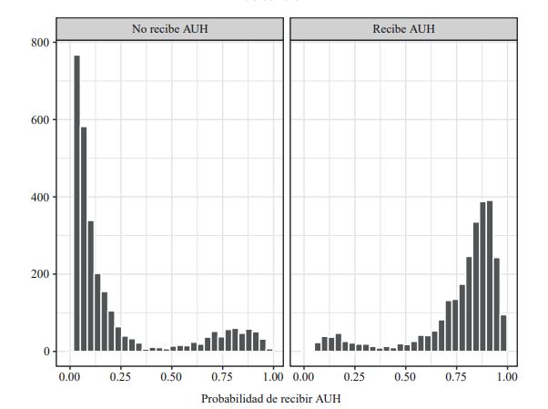 En este trabajo utilizamos Propensity Score Matching (PSM en adelante) con el objetivo de generar grupos comparables para estimar el efecto causal de la percepción de la AUH sobre los indicadores antropométricos de los niños menores de cinco años que viven en hogares en los cuales algún miembro recibe la asignación. Es decir, se estima el efecto promedio del tratamiento sobre los tratados (ATT por sus siglas en inglés).