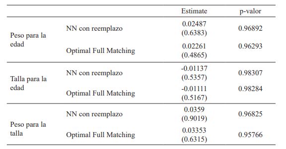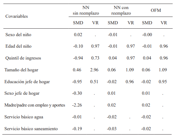La especificación “Nearest Neighbor con reemplazo” permitió una muestra apareada de 3 307 niños mientras que OFM utiliza todas las unidades tratadas y de control, por lo que ninguna observación fue descartada por el emparejamiento.