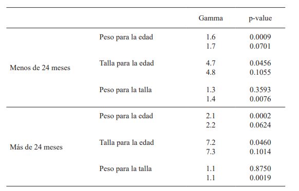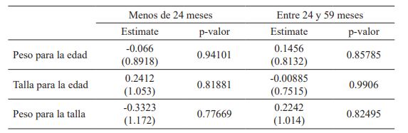 Adicionalmente, se realizó el mismo análisis dividiendo a los niños según la edad: menores de 24 meses por un lado y entre 24 y 59 meses por otro. Esto obedece a que una de las razones del limitado impacto observado de los programas de transferencias en la nutrición es que la medición a menudo se realiza sobre un grupo más amplio de niños, en lugar de sobre los del grupo de edad más vulnerable desde el punto de vista nutricional (Ruel & Alderman, 2013; Alderman, 2014). Este grupo está formado por mujeres embarazadas y niños menores de 2 años (denominados niños en los primeros 1 000 días desde la concepción) (UNICEF, 2013; Victora, 2010).