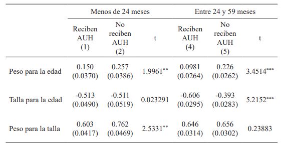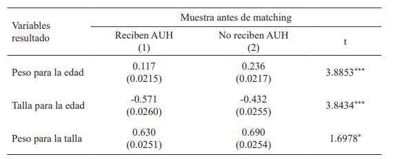 La tabla 1 presenta los valores medios de las tres variables de resultado para beneficiarios y no beneficiarios de la AUH en la muestra antes del matching. También se incluyen los resultados del test t para igualdad de medias en diferentes grupos. Las medias de los tres indicadores antropométricos son estadísticamente diferentes entre los niños que viven en hogares en los que al menos un miembro recibe AUH y los que no, aunque para el peso para la edad y talla para la edad la diferencia es significativa a un nivel de confianza del 99% y para el peso para la talla del 90%.