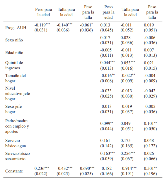 Por su parte, no se cuenta, hasta el momento, con estudios que estimen el impacto de la AUH sobre medidas antropométricas de los niños beneficiarios, aunque existen antecedentes de este tipo de estudios en la región. La evidencia referida al impacto de las CCT sobre indicadores antropométricos no es concluyente, presentando resultados diferentes de acuerdo a las regiones y programas analizados. De Melo et al. (2016) realizan una revisión de estudios para Brasil, México, Ecuador y Nicaragua y observan que no todos los beneficiarios presentan efectos positivos sobre el crecimiento, con diferencias según la edad. Los mismos resultados contradictorios son expuestos por Lagarde, Haines y Palmer (1996), quienes también realizan una revisión bibliográfica para países latinoamericanos encontrando evidencia de impacto positivo en el peso para la edad para niños menores de 24 meses, pero no significativo para mayores de esa edad en Colombia y negativo en niños menores de 7 años en Brasil. Respecto a la talla para la edad, se encuentran efectos positivos en menores de cinco años para el caso de Nicaragua, en menores de 6 meses y entre 12 y 36 meses en México, pero efectos estadísticamente no significativos para niños entre 6 y 12 meses en el mismo país. Adicionalmente, siguiendo a Manley, Gitter y Slavchevska (2012), algunos programas demuestran tener éxito en mejorar el estado nutricional, mientras que otros trabajos exponen resultados que los contradicen.