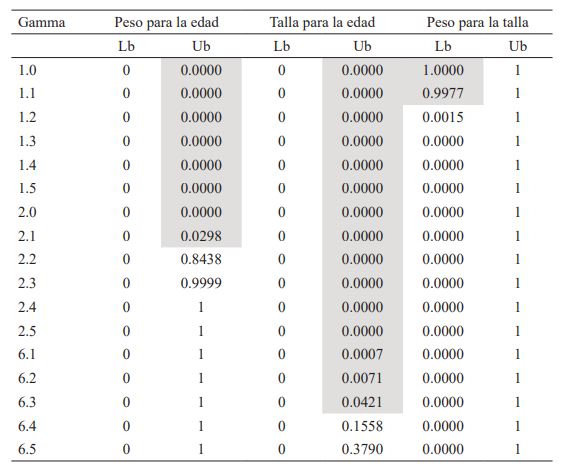 Peso para la edad: representa una medida de desnutrición aguda y crónica. Una diferencia mayor a dos desvíos estándar (sd por sus siglas en inglés) por debajo de la mediana de la población de referencia indica bajo peso moderado o severo y mayor a tres, severo.