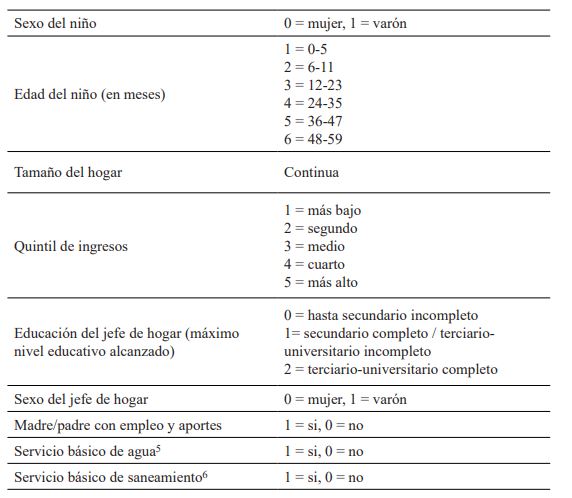 A través de un muestreo polietápico, se seleccionó una muestra de 31 240 viviendas asegurando la representatividad en cada una de las regiones del país, así como de cada grupo poblacional. Debido a la pandemia de COVID-19 no fue posible visitar toda la muestra, aunque al finalizar el trabajo de campo se controló que hubiera relevamientos en todos los estratos definidos. Si bien la AUH está dirigida a menores de 18 años, en esta investigación se trabajó con las medidas antropométricas y estas sólo fueron tomadas en niños menores de 5 años. De los 6 343 niños menores de cinco años listados en los cuestionarios del hogar, 6 157 completaron la encuesta. De estos últimos, 5 575 tienen información completa sobre las medidas antropométricas, así como de las características individuales y del hogar consideradas para el análisis, conformando así la muestra con la que se trabajó.
