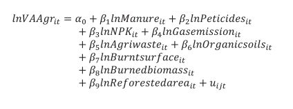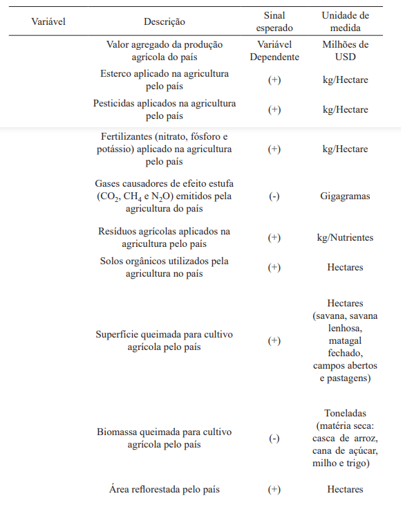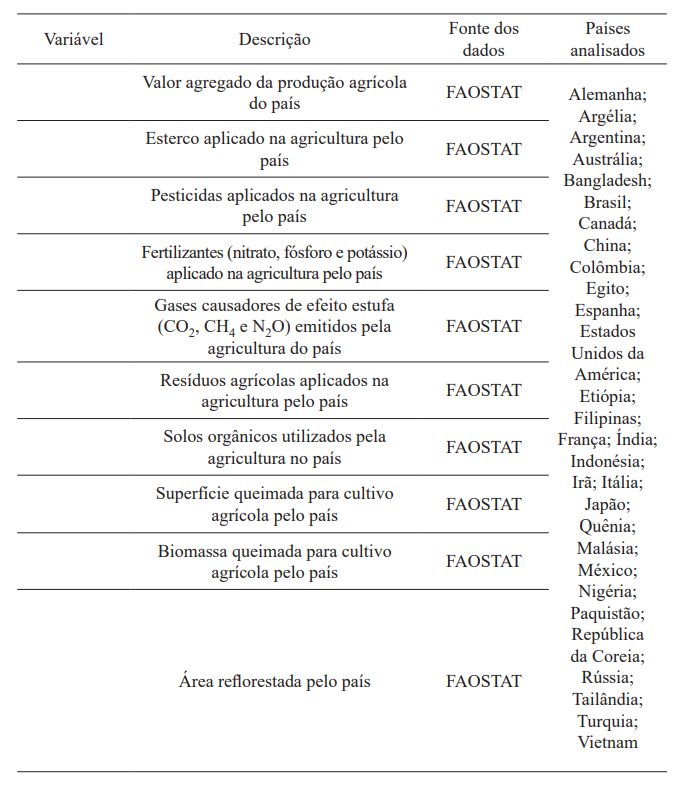 (1)Em que: V AAgrit representa o valor agregado da produção agrícola, do país i; representa a constante do modelo de regressão; Manureit é a quantidade de esterco aplicado na agricultura pelo país i; Peticidesit é a quantidade de pesticidas aplicados na agricultura pelo país i; NPKit, é a quantidade de fertilizantes (nitrato, fósforo e potássio) aplicado na agricultura pelo país i; Gasemissionitse refere à quantidade de gases causadores de efeito estufa (CO2, CH4 e N2O) emitidos pela agricultura do país i; Organicsoilsitse refere à utilização de resíduos agrícolas aplicados na agricultura pelo país i; Burntsurfaceit é a quantidade de solos orgânicos utilizados pela agricultura no país i; Burnedbiomassit é a superfície queimada para cultivo agrícola pelo país i; Reforestedareaité a biomassa queimada para cultivo agrícola pelo país i, uijté a área reflorestada pelo país e representa o termo de erro da equação.