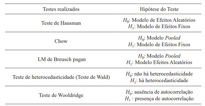 Além do teste de Hausman (1978), outros testes foram realizados, como teste Chow, teste de Wald, Breusch e Pagan (1980) e teste de Wooldridge (2016). Diante disso, para a verificação do modelo mais apropriado para o presente estudo, utilizou-se o teste de Hausman (1978), o teste Chow (1960) e o teste LM de Breusch e Pagan (1980). Assim, no teste de Hausman, a rejeição da hipótese nula (p < 0.05) indica que o modelo de efeitos fixos é mais apropriado que o modelo de efeitos aleatórios; caso contrário, é preferível o modelo de efeitos aleatórios. No teste Chow, a rejeição da hipótese nula (p < 0.05) indica que o modelo de efeitos fixos é mais apropriado que o modelo pooled; caso contrário, é preferível o modelo pooled. E, no teste LM de Breusch-Pagan, a rejeição da hipótese nula (p < 0.05) indica que o modelo de efeitos aleatórios é mais apropriado que o modelo pooled; caso contrário, é preferível o modelo pooled.