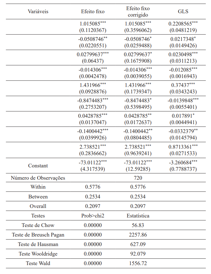 Os testes realizados para a escolha do modelo, disponíveis na Tabela 1, apontaram que o melhor estimador é o método de efeitos fixos, o mais adequado para representar o modelo a ser analisado neste trabalho. No entanto, o teste de Wald detectou a presença de heterocedasticidade neste modelo, sendo, portanto, necessário realizar a correção deste. Já o teste de Wooldridge apontou a existência de autocorrelação dos resíduos do modelo.