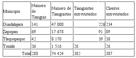 Si se considera como variable distintiva el sitio donde cada uno de los tianguis se establece, independientemente de los días de operación a la semana, en la zona metropolitana de Guadalajara existen 288 tianguis, de los cuales 141 se ubican en el municipio de Guadalajara, 69 en el municipio de Zapopan, 42 en el municipio de San Pedro Tlaquepaque y 36 en el municipio de Tonalá. Tomando como unidad de muestreo los comerciantes de dichos tianguis, se entrevistó a 382 tianguistas (Tabla 1) cuyos datos, según los principios del muestreo aleatorio simple (con un nivel de confianza del 95 % y margen de error del 5 %), son representativos de los 74.424 comerciantes que constituyen el universo total, de acuerdo con los datos que previamente fueron proporcionados por las autoridades de cada uno de los cuatro Ayuntamientos. Con el objetivo de poder generar información de los tianguis como unidades, por un lado y, por otro lado, para optimizar el desplazamiento y trabajo de 3 equipos de cuatro encuestadores cada uno durante ocho semanas de trabajo de campo, se decidió cubrir la muestra con énfasis en 30 tianguis, mismos que fueron seleccionados de manera aleatoria de un directorio que se integró a partir de los datos obtenidos de las áreas administrativas correspondientes de los municipios en cuestión. En cada tianguis se buscó recoger entre 10 a 30 encuestas según el tamaño de los mismos, tratando de respetar la proporcionalidad de sus giros comerciales, mismos que se contabilizaron y clasificaron previo al levantamiento de las encuestas. Las entrevistas se realizaron directamente en los puestos de venta con el objeto de determinar el perfil del comerciante, los datos del local comercial, el proceso de abastecimiento, la evolución del negocio y la valoración de los servicios generales del tianguis como unidad.