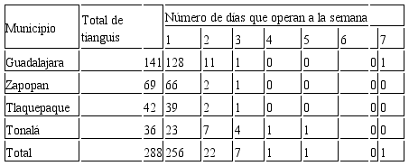 Como se mencionó anteriormente, si se toma como referencia el lugar de la vía pública donde operan, en la zmG existen 288 tianguis, de los cuales 256 (89 %) solo operan un día a la semana, 22 trabajan 2 días a la semana y 10 funcionan de 3 a 7 días a la semana (Tabla 2).