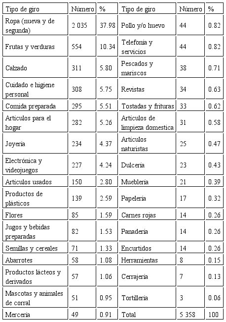 Los 30 tianguis bajo estudio albergan 5 358 puestos de venta de productos de 33 giros diferentes, destacando tanto por su cantidad como por su presencia prácticamente en todos los tianguis, los de ropa nueva y usada, frutas y verduras, calzado, cuidado e higiene personal, comida preparada y artículos para el hogar (Tabla 3). El 96 % de los locales son atendidos directamente por sus propietarios o algún familiar directo y el 4 % restante por un arrendatario; estos últimos casos se concentran en los comercios de ropa, frutas y verduras y artículos para el hogar, principalmente y, en menor medida, en los de calzado, higiene personal y videojuegos.