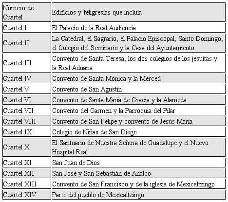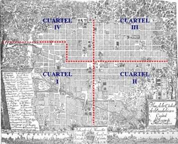 Al año siguiente, en 1791 la ciudad volvió a dividirse. En esta ocasión Félix María Calleja, organizó cuatro grandes cuarteles cuyos ejes principales partieron de la plaza mayor, espacio que se identificó como el núcleo gravitacional del conjunto urbano (Gálvez Ruiz, 1996, p.48).