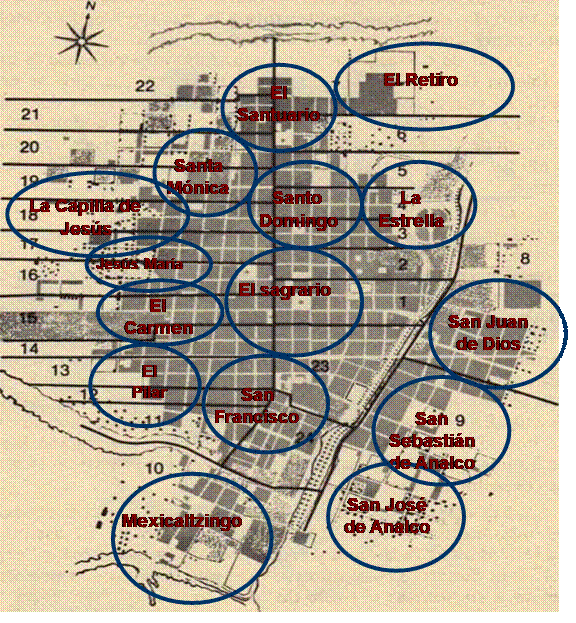 Los barrios se organizaron en torno a las iglesias y conventos lo que se constituyó como polos de crecimiento de la ciudad. Los edificios religiosos ordenaron la vida cotidiana y la identidad barrial; siendo las fiestas patronales fueron uno de los principales elementos integradores. Un caso excepcional fue el barrio de la Estrella (ubicado al noroeste de la ciudad), el cual no se organizó entorno a una edificación religiosa; en su lugar, se caracterizó por lo accidentado de su terreno, en él se instalaron tenerías, y durante la segunda mitad del siglo XVIII se fundó el Paseo de la Alameda (López, 1992, p.69-85).