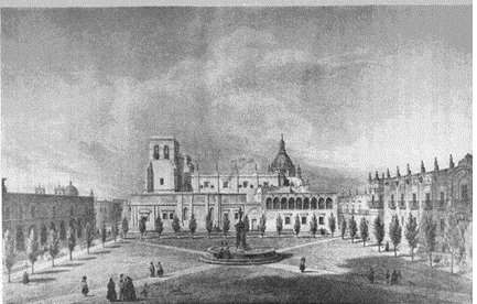 El núcleo gravitacional tenía “una imagen monumental y compacta” del poder religiosos, regio y mercantil (Olveda, 2000, p. 117) (ver Imagen 2). En la Plaza Mayor se ubicó el mercado, que en 1797 se trasladó a la plazuela de San Agustín espacio donde los moradores de la ciudad adquirían todo tipo de productos[8]. La plaza estaba rodeada por la Catedral, la sede de la Audiencia, la casa del Cabildo Municipal, el Palacio Episcopal y las casas comerciales más importantes. En sus arcos, además se instalaron comercios, entre los que destacaban las pulquerías, donde la gente acudía para conversar y embriagarse.