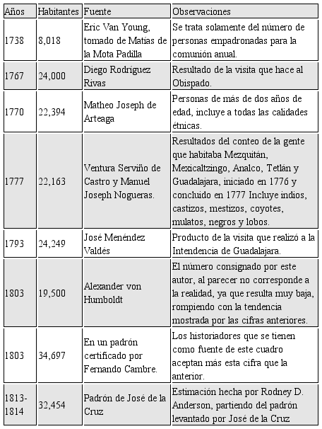 Como puede apreciarse, la inmigración se registró en dos sentidos; el primero externo, de personas provenientes de lugares fuera de la Nueva Galicia, sobre todo de las regiones centrales de la Nueva España, y el otro interno, compuesto por vecinos de localidades cercanas (Gálvez Ruiz, 1996, p.86-87). Autores como Van Young insisten en que para la década de 1790 la capital neogallega se consolidó como la cuarta urbe más poblada de la Nueva España, solo por debajo de las ciudades de México, Puebla de los Ángeles y Guanajuato( Van Young, 1989, p. 47).