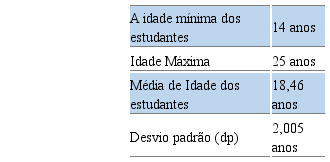 Conforme se observa na Tabela1, quanto a idade, os adolescentes e jovens têm como Idade mínima=14 e idade máxima=25 anos, possuem idades muito próximas entre eles dp=2,005, sendo a média de idade=18,46 anos.