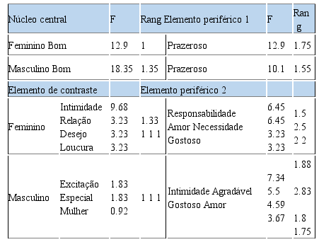Sobre o Quadro 1, os adolescentes e jovens dos dois géneros descrevem o sexo como algo bom (12-rang 1; 18.35-rang 1.35), e prazeroso (12.9-rang 1.75; 10.1-rang 1.55). Percebe-se que, associado ao termo indutor sexo, os adolescentes e jovens realçaram palavras de intimidade (9.68-rang 1.33; 7.34-rang 1.88), desejo para o género feminino (3.23-rang 1), excitação para o género masculino (1.83-rang 1) e amor (6.45-rang 5; 3.67-rang 1.75), revelando que os adolescentes e jovens do género masculino associam sexo à busca de prazer, apenas, diferente do género feminino, que busca por afectividade.