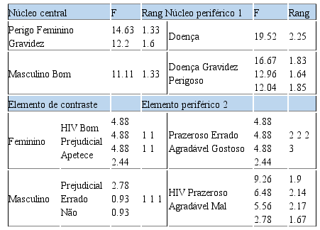 Por outro lado, no estudo de Michel Morin sobre as práticas de prevenção dos "jovens" versus o risco representado pelo SIDA, termo como HIV foi relacionado com doença, morte e rejeição social, porém junto de palavras como amor, confiança e liberdade sexual. Semelhante aos nossos resultados (prazer, agradável, gostoso) (Abric, 2001). Vista neste ângulo, Abric e Flamet, esclarecem que o HIV não contitui uma representação independente, pois entra numa esfera denominada de "conflito de representação", isto é em relação ao "comportamento exigido", "comportamento declarado" e pelo facto de que no acto sexual a pessoa portar ou não o preservativo (Abric, 2001).