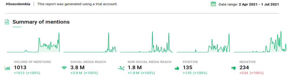 It is an investigation with a transectional-descriptive design in which conversations of people in cyberspace were captured around the hashtag #SOSCOLOMBIA. Quantitative research was used to extract data on the use of the networks of those who participated in the conversations. Data mining, also known as a non-invasive technique, was used to capture conversations from April 2 to July 1, 2021 with the BRAND24, VICINITAS and TAGS v6.1.9.1 programs. Through BRAND24, there was access to data of 3.8 million users on social networks and 1.8 million from other platforms (Figure 1); 100 conversations were captured with the VICINITAS software and 10,077 conversations were captured with TAGS v6.1.9.1.