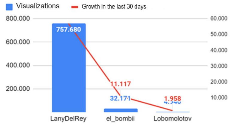 Views are one of the indicators of engagement. The ore views a common user or influencer has, the greater the engagement. Engagement is a term that refers to the degree of interaction that an account achieves with its followers on social networks. It measures the number of 'likes', shares, views, or comments on the posts (LAVERBENALAB, 2016). To get an idea of the engagement of LanyDelRey, we will use the formula: (757,680 Views / 14,980 Number of Followers) x 100; the result would be 5,057.94. Social media experts agree that a good engagement rate would be between 1% and 5%, depending on functions such as the sector in which the brand works, the size of its audience, or the type of content it publishes (Chantal, 2021).