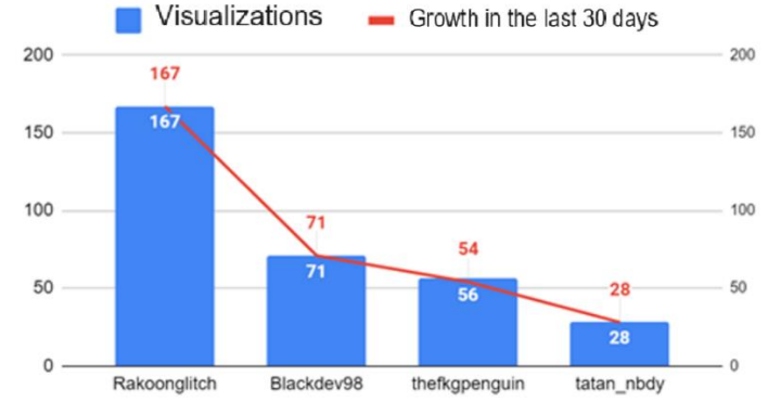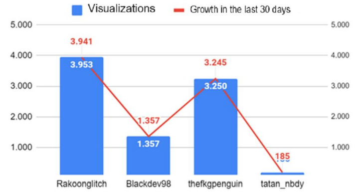 On the other hand, we have the most active users on Twitch, wich according to graph5 and table4 reflect a large number of views and growth in the last 30 days. As the most active user and with the highest number of views, we found Rakooglitch with a total of 3,953 views, followed by thefkpenguin with a total of 3,245 views.