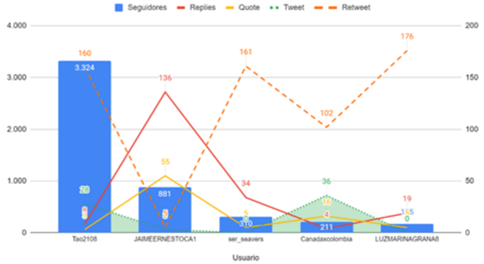 In graph 7 and table 5, we can see that there is a large participation of Twitter influencers in the social movement #SOSCOLOMBIA, finding, for example, @Tao2108 with 3324 followers, 28 tweets and 160 retweets, followed by @JAIMEERNESTOCA1 with 881 followers, 5 retweets, @ser_seavers with 310 followers, 0 tweets and 161 retweets, @Canadaxcolombia with 221 followers, 36 tweets and 102 retweets and finally @LUZMARINAGRANA8 with 175 followers, 0 tweets and 176 retweets. The participation was important because it allowed stimulating the information and, possibly, sensitizing the national and international population about what was happening in the social mobilization.