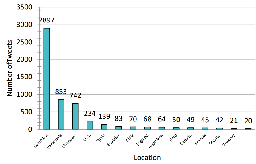 In graph 8 we can see that since #SOSCOLOMBIA is a Colombian movement, we find the highest number of tweets in the country that represents it (2897 tweets). However, the region was very aware and active in the social network, thus having countries such as Venezuela with a large participation (853 tweets), the United States (234 tweets), countries such as Chile, Ecuador, Peru (average of 50 tweets) and European countries such as England and France (average of 55 tweets). The social network allows observing that from other countries they have identified with the social movement and have shown their position on the platform.