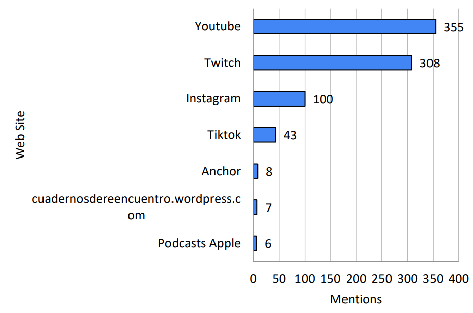 The website with the highest activity of the #SOSCOLOMBIA social movement was YouTube (355 mentions) surpassing important social networks such as Twitch (308 mentions), Instagram (100 mentions), Tik Tok (43 mentions), among others. This has made it possible to generate an audiovisual record on the social movement, for subsequent monitoring of the visibility of the movement both in Colombia and abroad.