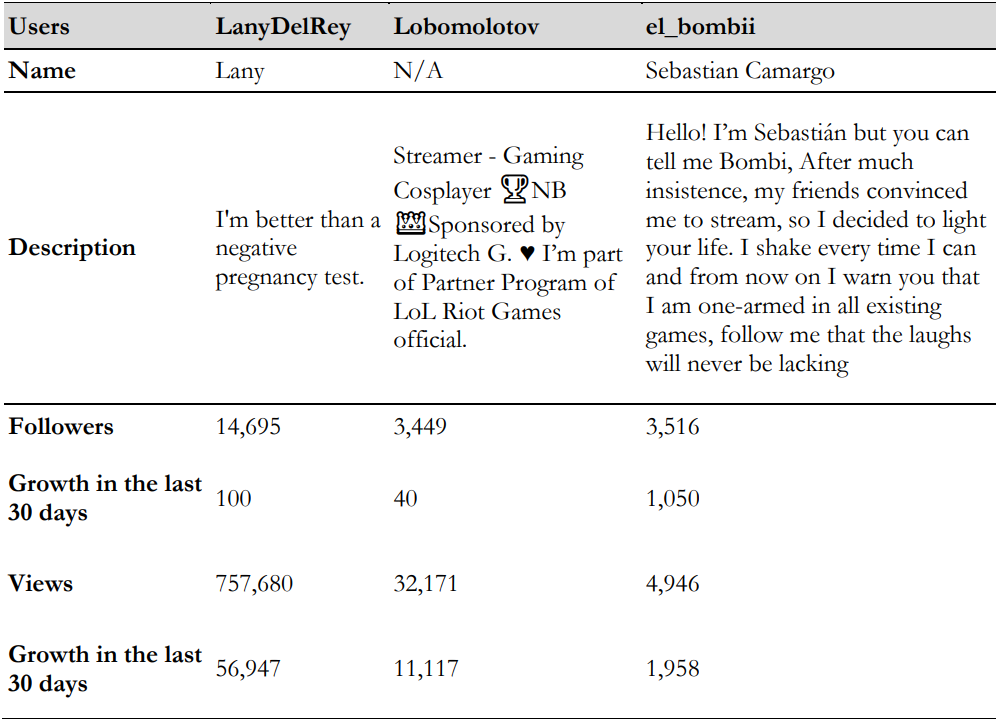 Regarding the views that Twitch influencers had by their followers, it can be seen in graph 4 that LanyDelRey has had a total of 757,680 views, well above el_bombii (32,171 views) and Lobomolotov (4,940 views). It should be mentioned that these last two influencers have had significant growth in the last 30 days (graph 4, table 3).