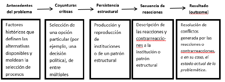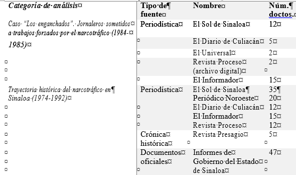 Para el análisis de la información, se estudió la trayectoria histórica del narcotráfico en Sinaloa desde sus inicios en los años de 1940 hasta la década de 1980. De igual forma, se analizaron algunos casos de la década de los años 2000, con el fin de comparar con los de años anteriores y detectar la persistencia de patrones de violencia contra el campesinado y utilización de trabajos forzados. Se abordó el enfoque conocido como path dependence (dependencia del camino), el cual considera que existe dependencia cuando un elemento o estructura social puede modificar radicalmente el curso de la historia. Según Mahoney (2001), con este método se concibe la historia como una cadena de causalidades; facilita la detección de actores y coyunturas claves para la producción de cambios trascendentales. Se analizan cinco fases: antecedentes, coyuntura crítica, persistencia estructural, secuencia de reacciones y resultados del fenómeno del narcotráfico en México. La ruta metodológica, con sus categorías de análisis, se describe en el siguiente cuadro: