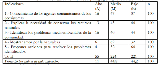La evaluación del nivel de aprendizaje de los contenidos medioambientales en la muestra seleccionada permitió constatar que los indicadores relacionados con los conocimientos de los agentes contaminantes de los ecosistemas, explicar la necesidad de los recursos naturales, identificar los problemas medioambientales de la comunidad y mostrar amor por la naturaleza alcanzan un nivel medio de dominio, intervalo (1,6-2,09) del índice promedio determinado, y el indicador proponer acciones para resolver los problemas identificados alcanza un nivel bajo de desarrollo al encontrarse en el intervalo (1,00-1,59). Ninguno de los indicadores alcanza el nivel alto de desarrollo. Los resultados del índice porcentual demuestran que los resultados del aprendizaje de los contenidos medioambientales de los sujetos de la muestra están en el entorno del nivel medio en el intervalo (0,466- 0,596) del valor del índice porcentual de la muestra definido.