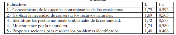 Haciendo un análisis de estas puntuaciones, de acuerdo a la norma establecida, se constata que los indicadores relacionados con los conocimientos de los agentes contaminantes de los ecosistemas, con explicar la necesidad de los recursos naturales, con identificar los problemas medioambientales de la comunidad y con mostrar amor por la naturaleza alcanzan un nivel medio de dominio de acuerdo al intervalo (1,6-2,09) y el indicador proponer acciones para resolver los problemas identificados, alcanza un nivel bajo de desarrollo al encontrarse en el intervalo (1,00-1,59). Ninguno de los indicadores evaluados alcanza el nivel alto de desarrollo.
