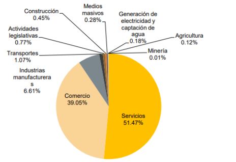 Por su parte, en 2019 el municipio de Puerto Vallarta contaba con 16,345 unidades económicas, de acuerdo con datos del Directorio Estadístico Nacional de Unidades Económica, (INEGI, 2019:22). A su vez, de las 16,345 empresas, 51.47% de ellas se dedicaban al ramo de los servicios, tal como se puede observar en la figura 2.