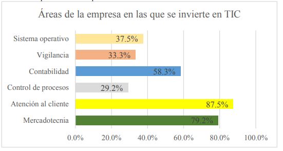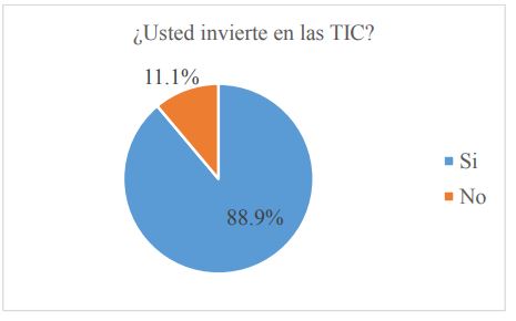 El 88.9% de las empresas entrevistadas expresan realizar alguna inversión en las TIC (ver figura 3). Se caracterizan porque sus clientes principales son extranjeros, 7 de cada 10 y provienen principalmente de EUA y Canadá. A diferencia de lo encontrado en el caso colombiano, de acuerdo con López-Rodríguez y López-Rodríguez (2018) consideran necesario contar con una página web y un correo electrónico; sin embargo 41% de las empresas no consideran necesaria la inversión en campañas publicitarias o la implementación de las TIC en sus procesos productivos, esto atribuido en general al desconocimiento del potencial de las TIC y a la deficiente investigación e innovación.