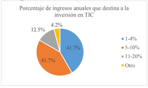 De las 45 empresas que realizan inversión en TIC el 83,4 % destina del 1 al 10% de sus ingresos anuales, cantidad con poco impacto, solamente el 12% de los encuestados invierte entre el 11 y el 20 por ciento de sus ingresos (ver figura 4).