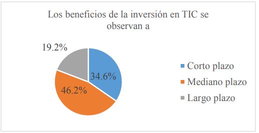 El 46.2% de los encuestados concuerdan que los beneficios en la inversión en TIC se observan a mediano plazo, lo cual coincide la perseverante falta de entendimiento sobre los beneficios de las TIC tal como han expuesto otros autores (ver figura 6). Pese a los numerosos beneficios de la implementación de las TIC, Ríos-Manríquez, et al (2009) concluyen que, el principal inhibidor para la adopción de la tecnología es la falta de interés por parte de los empresarios, derivado del desconocimiento que la tecnología puede hacer por la empresa o el pensamiento que los beneficios de la inversión se verán solamente a largo plazo.
