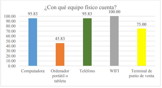 De las empresas del sector turístico de la localidad encuestadas el 100% cuenta con WIFI y, casi en su totalidad, cuentan con una computadora y telefonía móvil como parte de su equipo físico (ver fig. 7). Dicho equipo físico se renueva cada 2 a 3 años de acuerdo con el 12.5% de los encuestados, 4 a 6 años de acuerdo a un 54.2% y un 25% no se ha visto aún en la necesidad de renovarlo.