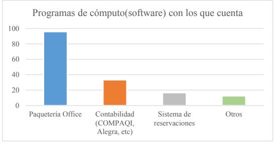 Pese a los numerosos programas informáticos que se ofertan en el mercado, el equipo físico de los encuestados se ve limitado al uso de la paquetería office o algún software de contabilidad y en determinados casos, el uso de algún sistema de reservaciones. Y es que más de dos terceras partes de las empresas brinda capacitación a los empleados en el manejo de software. Aunque en su gran mayoría no cuentan con una aplicación propia; por lo anterior se considera que las organizaciones encuestadas se encuentran aún en un proceso de transición a las nuevas tecnologías presentando un nivel de adaptación medio-alto. El imaginario colectivo de las empresas de la localidad en su mayoría considera que los beneficios de la inversión en TIC se observan a mediano y corto plazo, lo cual denota una evolución positiva en la mente de los emprendedores.