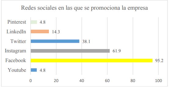 El 91.6% de los encuestados que invierten en TIC cuentan con su propia página web, no obstante, solamente el 16.7% cuentan con una app propia (ver figura 9). No todas las empresas cuentan con las mismas oportunidades de acceso a la tecnología, de acuerdo a la Organización para la Cooperación y el Desarrollo Económico, OCDE (2017:179) en 2016, el 77 por ciento de las empresas en países miembros contaban con acceso a internet y con su propio portal web, desafortunadamente, en México, menos del 40% de las empresas contaban con su propia página web; a su vez, la OCDE concluye que las empresas no están aprovechando al máximo el potencial que ofrecen las TIC. Facebook es la red social en la que más se promocionan las empresas, seguidas de Instagram y twitter (ver figura 10). El uso de las plataformas virtuales apoya de manera significativa en la competitividad de los negocios pymes como lo demuestra el trabajo publicado por Saldaña –De Lira et al (2021) en donde deberán enfocarse principalmente en su interacción con clientes, proveedores y desempeño financiero para lograr permanecer en un mercado.