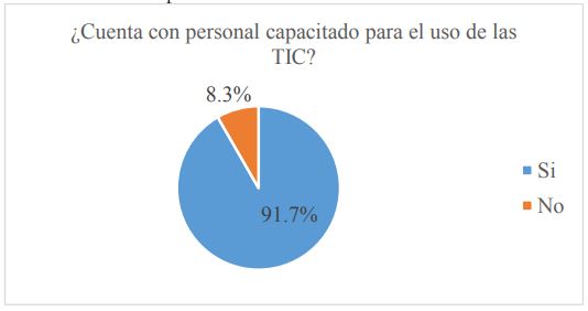 El 91.7% de los encuestados considera que cuenta con personal capacitado para el uso de las TIC, sin embargo, solamente el 41.8% capacita a sus empleados en el uso dicha tecnología (ver figura 12). En contrario a lo encontrado por Becerra-Bizarrón et al, (2018) quienes exponen que, en Puerto Vallarta, las MiPyMES dentro de las causas que originan el fracaso son; el poco acceso al financiamiento, la escasa asistencia técnica, el desconocimiento del mercado, la falta de estudios para identificar los clientes potenciales y el poco entrenamiento de su personal.