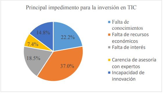 Finalmente, las empresas que invierten en las TIC consideran que el principal impedimento para que otras empresas inviertan en tecnologías es la falta de recurso económico seguido por la falta de conocimientos y la falta de interés (ver figura 13).