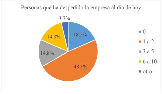 El 48.1% de los encuestados ha despedido de 1 a 2 personas, el 14.8% de 3 a 5 personas, el 14.8% de 6 a 10 personas y un 3.7% otra cantidad debido a la incorporación de programas computacionales y al Home Office derivado de la contingencia por COVID 19 (ver figura 14).