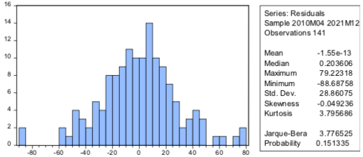 Al realizar el análisis de la normalidad de los residuos a través del estadístico de Jarque–Bera se evidencia que es menor que el nivel de confianza, entonces significa que se rechaza 𝐻0 y con ello se evidencia que los residuos no se distribuyen normalmente (Figura 1). Por tanto, no se cumple este supuesto del modelo. Hay que tener en cuenta que la muestra es lo suficientemente grande, por lo que debería seguir una distribución normal según lo establece la ley de los grandes números, pero a pesar de eso no se cumple esta condición.
