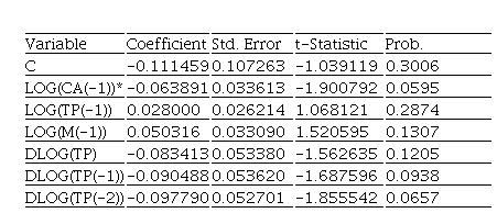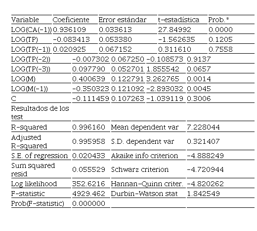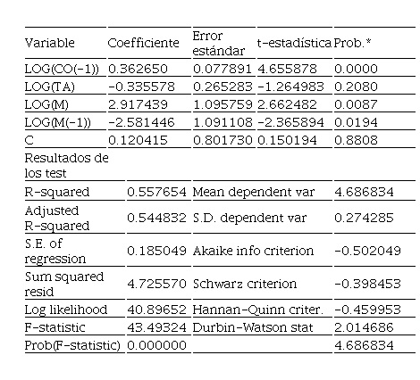 Para la selección del modelo se tuvieron en cuenta los criterios de Akaike en el número posible de rezagos. La tabla 4 muestra un modelo con un coeficiente de determinación de 0.55 y tres estimaciones estadísticamente significativas, una en el primer rezago de la variable dependiente y otra para la variable oferta monetaria, pero con coeficiente mayor que 1, lo que indica un alto grado de variabilidad de los datos con respecto a la variable dependiente.