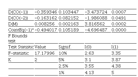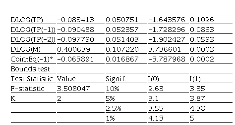 El coeficiente de cointegración es negativo y no significativo (-0.05) lo que presupone que las variables involucradas en el modelo están relacionadas de manera inversa a largo plazo, indicando la velocidad de ajuste de convergencia de equilibrio a largo plazo con un nivel de significación del 5%. El estadístico F según el Bounds test es mayor que el valor calculado sólo para el 10 % de significación, por lo que se rechaza H0 y se acepta la hipótesis alternativa de relación en nivel de las variables a largo plazo (Tabla 12)