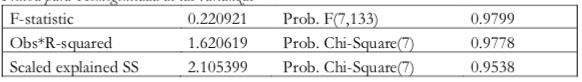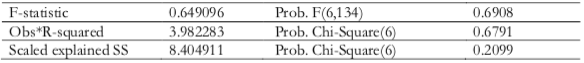 De igual manera se puede comprobar que no existe heterocedasticidad cumpliendo así uno de los supuestos básicos del modelo de regresión, proporcionando fiabilidad en las estimaciones asegurando que los resultados obtenidos son robustos y confiables. Al ser la probabilidad es mayor que 0.05 (Tabla 7), por lo que no rechazo H0.