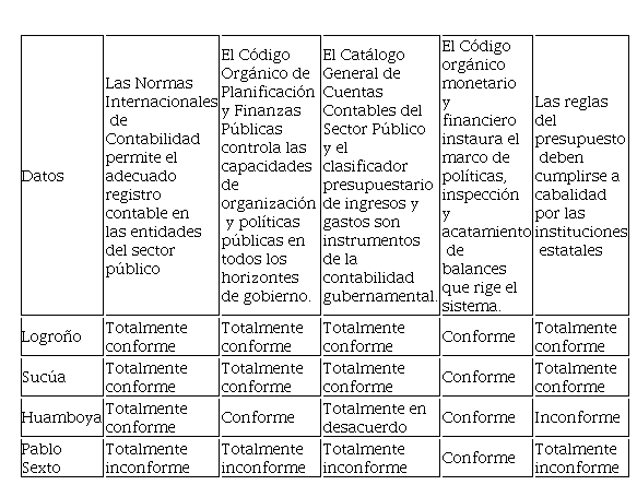 En la tabla No. 1 se analizó el componente Normas legales, para lo cual se consideró el cumplimiento de distintos reglamentos o normativas, entre ellas, las Normas Internacionales de Contabilidad en donde el 75% de los cantones (Logroño, Sucúa y Huamboya) señalan que dichas normas permiten el adecuado registro contable en las entidades del sector público, mientras que el 25% (Pablo Sexto señala que no). En el caso del Código Orgánico de Planificación y Finanzas Públicas el 50% (Logroño y Sucúa) expresa que está totalmente de acuerdo con la idea de que esta normativa regula las competencias de planificación y de la política pública en todos los niveles de gobierno, mientras que un 25% (Huamboya) se muestra conforme y un 25% (Pablo Sexto se expresa totalmente inconforme). En cuanto al Catálogo General de Cuentas Contables del Sector Público y el clasificador presupuestario de ingresos y gastos como instrumento de la contabilidad gubernamental, el 50% (Logroño y Sucúa) se muestran totalmente conformes, el 25% (Huamboya) totalmente en desacuerdo y el 25% (Pablo Sexto) totalmente inconforme, y por último en referencia al cumplimiento del Código orgánico monetario y financiero y las reglas del presupuesto, el 50% (Sucúa y Logroño) están totalmente conformes, mientras que el 25% (Huamboya) se expresa inconforme y el 25% restante (Pablo Sexto) se muestra totalmente inconforme.